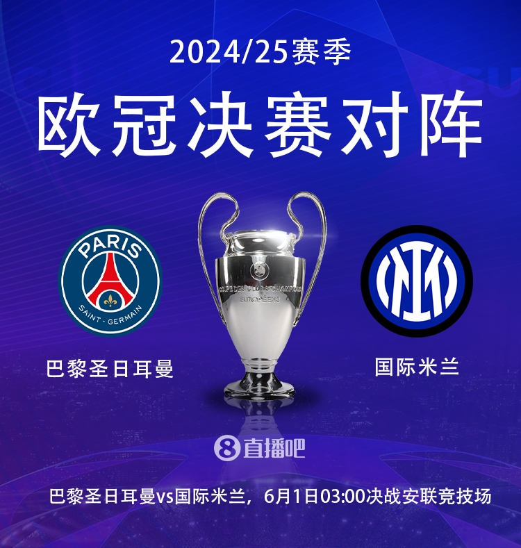 欧冠决赛,国米vs巴黎。巴黎还未拿过欧冠冠军,国米拿过3次欧冠。